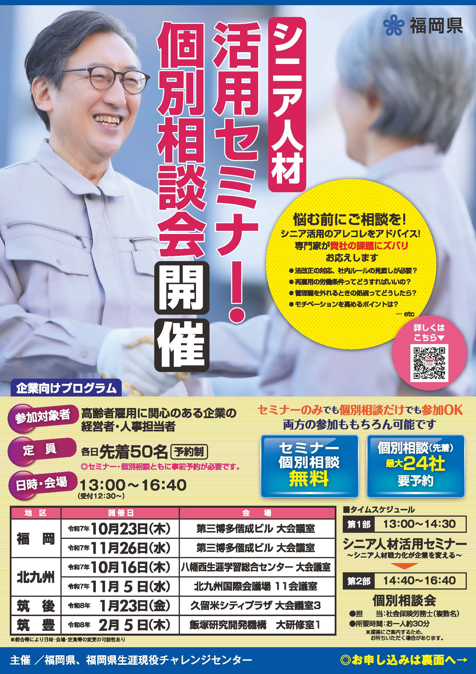 【福岡】令和7年10月23日(木)13:00~16:40 第三博多偕成ビル 令和7年11月26日(水)13:00~16:40 第三博多偕成ビル 【北九州】令和7年10月16日(木)13:00~16:40 八幡西生涯学習総合センター令和7年11月 5日(水)13:00~16:40 北九州国際会議場 【筑後】令和8年 1月23日(金)13:00~16:40 久留米シティプラザ 【筑豊】令和8年 2月 5日(木)13:00~16:40 飯塚研究開発機構
