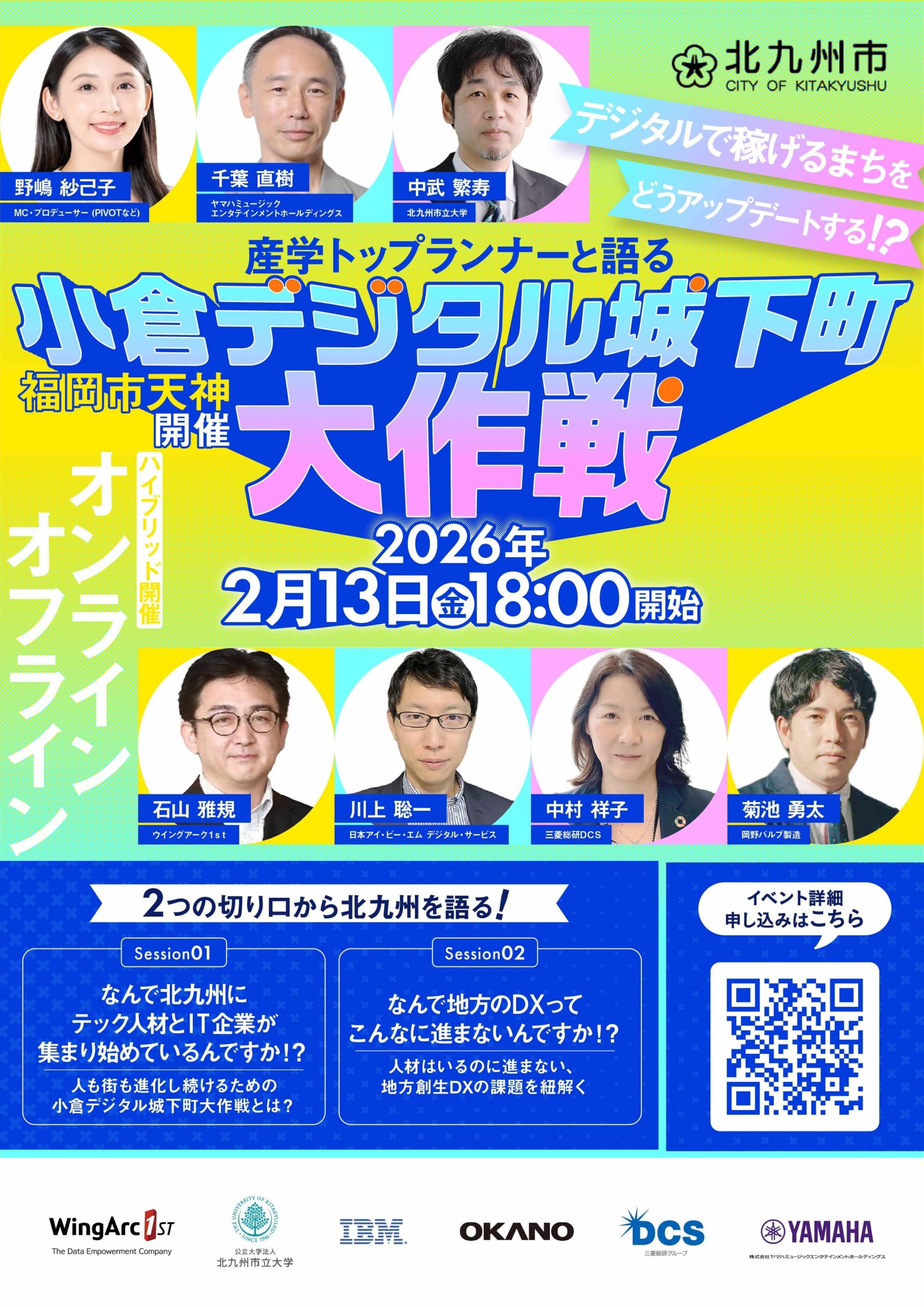 | 登壇企業(順不同) | ・北九州市立大学 ・株式会社ヤマハミュージックエンタテインメントホールディングス ・ウイングアーク1st株式会社 ・日本アイ・ビー・エム デジタル・サービス株式会社 ・三菱総研DCS株式会社 ・岡野バルブ製造株式会社 |